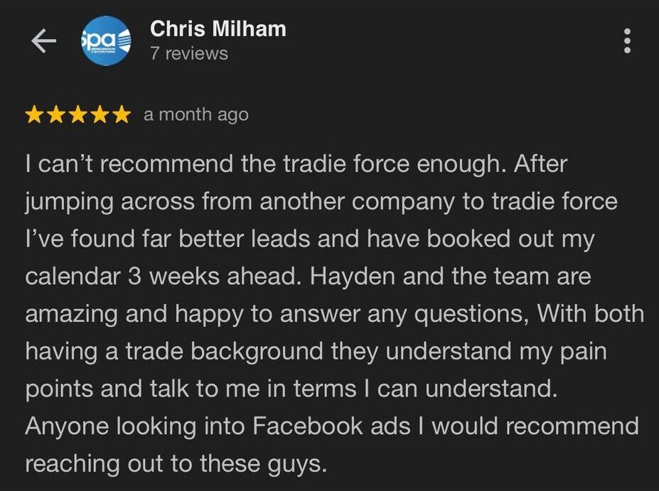 Now I run Tradie Force, a growth agency that’s helped over 60 trade businesses scale fast.